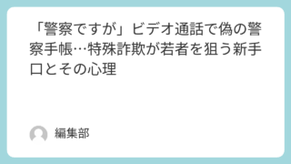 事件 「警察ですが」ビデオ通話で偽の警察手帳…特殊詐欺が若者を狙う新手口とその心理 このニュースが報じられた年月日2025年06月30日同じニュースを報じている記事一覧とリンク北海道文化放送: 【特殊詐欺に新手口!】「 携帯電話が送られてきた」固定電話だけの高齢女性のもとに詐欺グループからスマホが送りつけられ、ビデオ通話で... 2025.07.05 事件法律社会