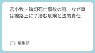 事故 苫小牧・踏切死亡事故の謎。なぜ車は線路上に?潜む危険と法的責任 このニュースが報じられた年月日2025年6月28日同じニュースを報じている記事一覧とリンクHBC北海道放送: 踏切で貨物列車と軽乗用車が衝突 年代性別不明の1人が死亡、事故の直前「踏切の中で止まっている」目撃者からの通報 北海道苫小牧市HT... 2025.06.29 事故交通