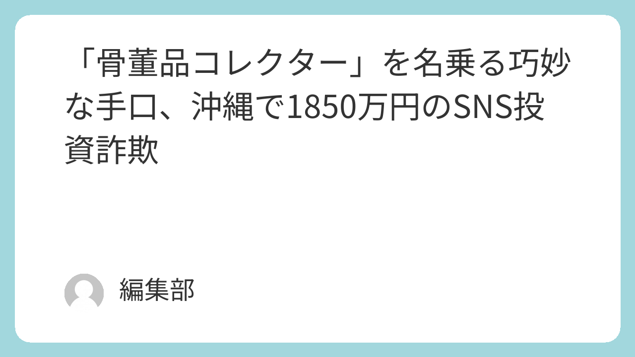 - 沖縄タイムス: 骨董品コレクターを名乗る男から… 金貨の投資を持ちかけられ 70代男性、1850万円だまし取られる