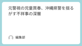 事件 元警視の児童買春、沖縄県警を揺るがす不祥事の深層 このニュースが報じられた年月日2025年6月26日同じニュースを報じている記事一覧とリンク琉球朝日放送: 元警視 児童買春などの疑いで逮捕沖縄テレビ放送: 児童買春容疑の警察官を送検 子どもを守るべき立場の犯行に非難もこのニュースの3つのポ... 2025.06.26 事件社会