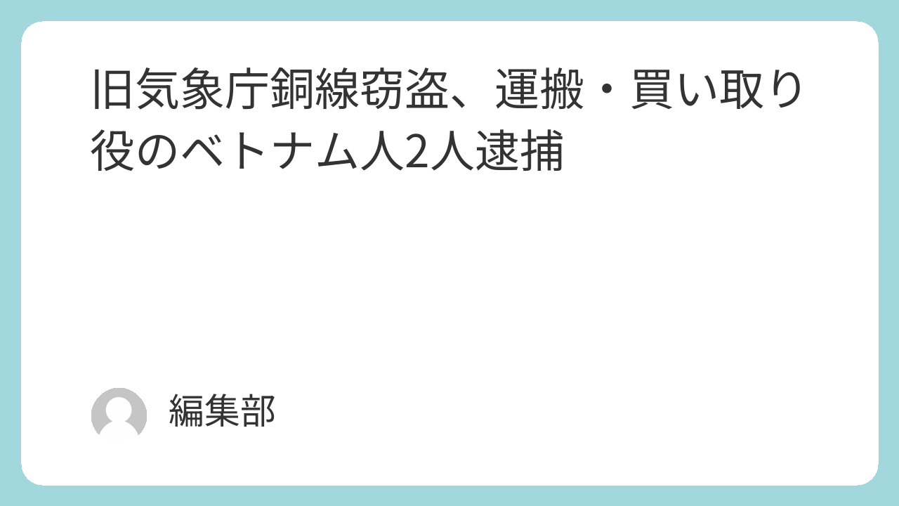 - 産経新聞: 旧気象庁庁舎から銅線ケーブル窃盗疑い、ベトナム国籍の男2人逮捕 警視庁 買い取り役か