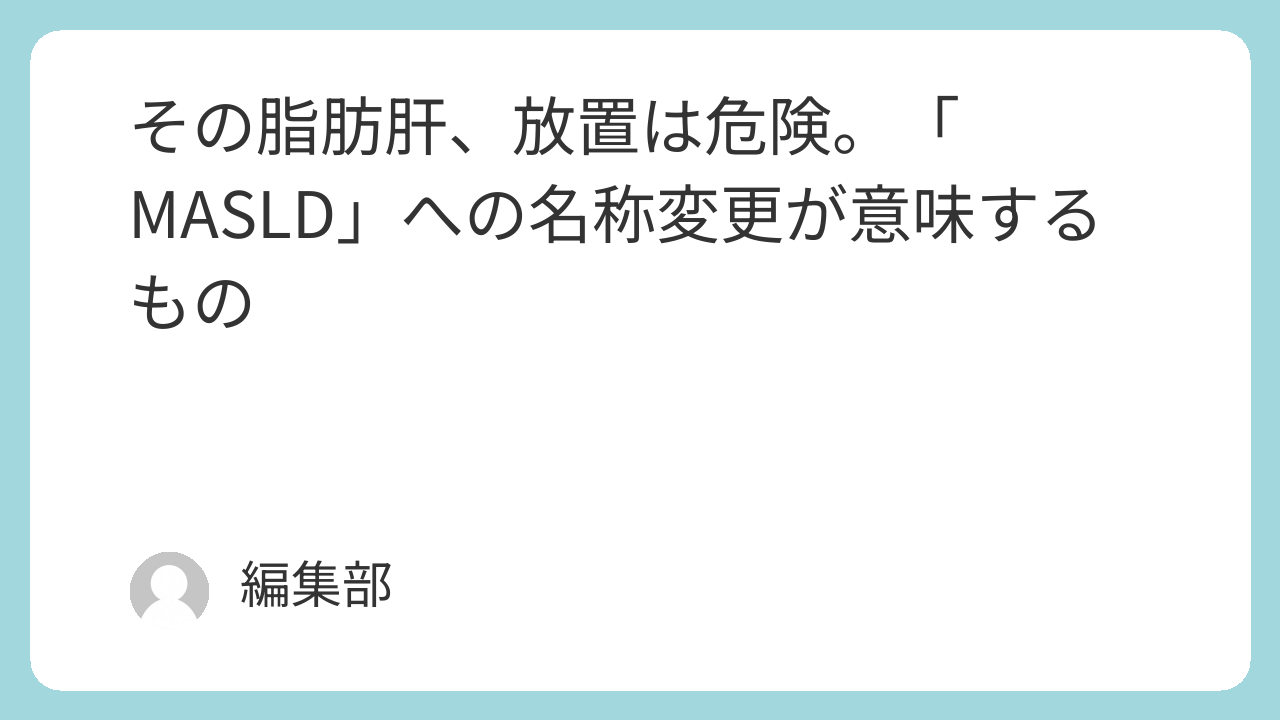 - 従来の「非アルコール性脂肪性肝疾患(NAFLD)」は、「代謝機能障害関連脂肪性肝疾患(MASLD)」という新名称に変更された。