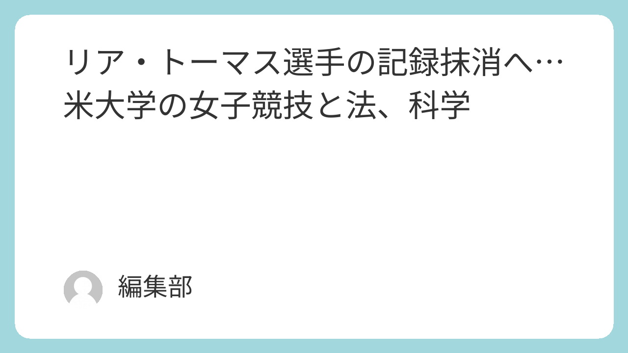 - AP通信:(ペンシルベニア大学、リア・トーマス選手の水泳記録を更新、トランスジェンダー選手訴訟で連邦政府と和解(英文記事))