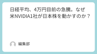 IT 日経平均、4万円目前の急騰。なぜ米NVIDIA1社が日本株を動かすのか? このニュースが報じられた年月日2025年6月26日同じニュースを報じている記事一覧とリンク株探ニュース: 【↑】日経平均 大引け| 3連騰、半導体関連が買われ3万9000円台回復YouTube(朝倉慶のASK1): 2025年6月26日【A... 2025.06.27 IT経済金融