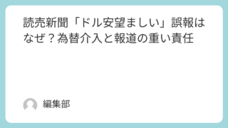 メディア 読売新聞「ドル安望ましい」誤報はなぜ?為替介入と報道の重い責任 このニュースが報じられた年月日2025年07月02日同じニュースを報じている記事一覧とリンク共同通信: 読売新聞、為替協議の記事訂正 財務相会談「ドル安望む」産経新聞: 読売、為替協議の記事訂正 財務相会談「ドル安望む」 発言を誤解して報じ... 2025.07.02 メディア為替経済