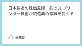 テクノロジー 日本鋳造の株価急騰、鉄の3Dプリンター技術が製造業の常識を変える このニュースが報じられた年月日2025年07月01日同じニュースを報じている記事一覧とリンク日本経済新聞: 日本鋳造、3Dプリンターで部品 99%の鉄で造形日本鋳造株式会社:(ニュースリリース、「記事の解説はこちらから」ボタンの先に同社によ... 2025.07.02 テクノロジー投資経済