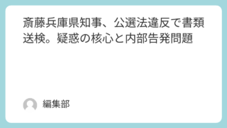 政治 斎藤兵庫県知事、公選法違反で書類送検。疑惑の核心と内部告発問題 このニュースが報じられた年月日2025年06月20日同じニュースを報じている記事一覧とリンク時事通信:(斎藤知事を書類送検=再選選挙で買収容疑―PR会社社長も・兵庫県警)MBSニュース(YouTube):(【ノーカット】斎藤知事の代理人弁護... 2025.07.02 政治法律
